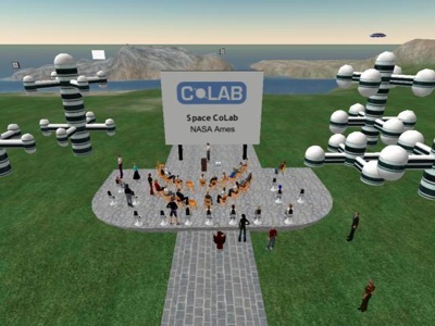At a public talk held in Second Life, Drew Frobozz unveiled the NASA CoLab (Collaboration Laboratory). The International Spaceflight Museum has agreed to develop the prototype island pro bono over the next two months. The facility follows my own blueprint for three islands: “Earth” for meetings between NASA employees and collaborators, “Moon” sandbox (seen above) for the public construction of new Second Life projects, and “Mars” for the development of more sophisticated long-term Second Life projects.