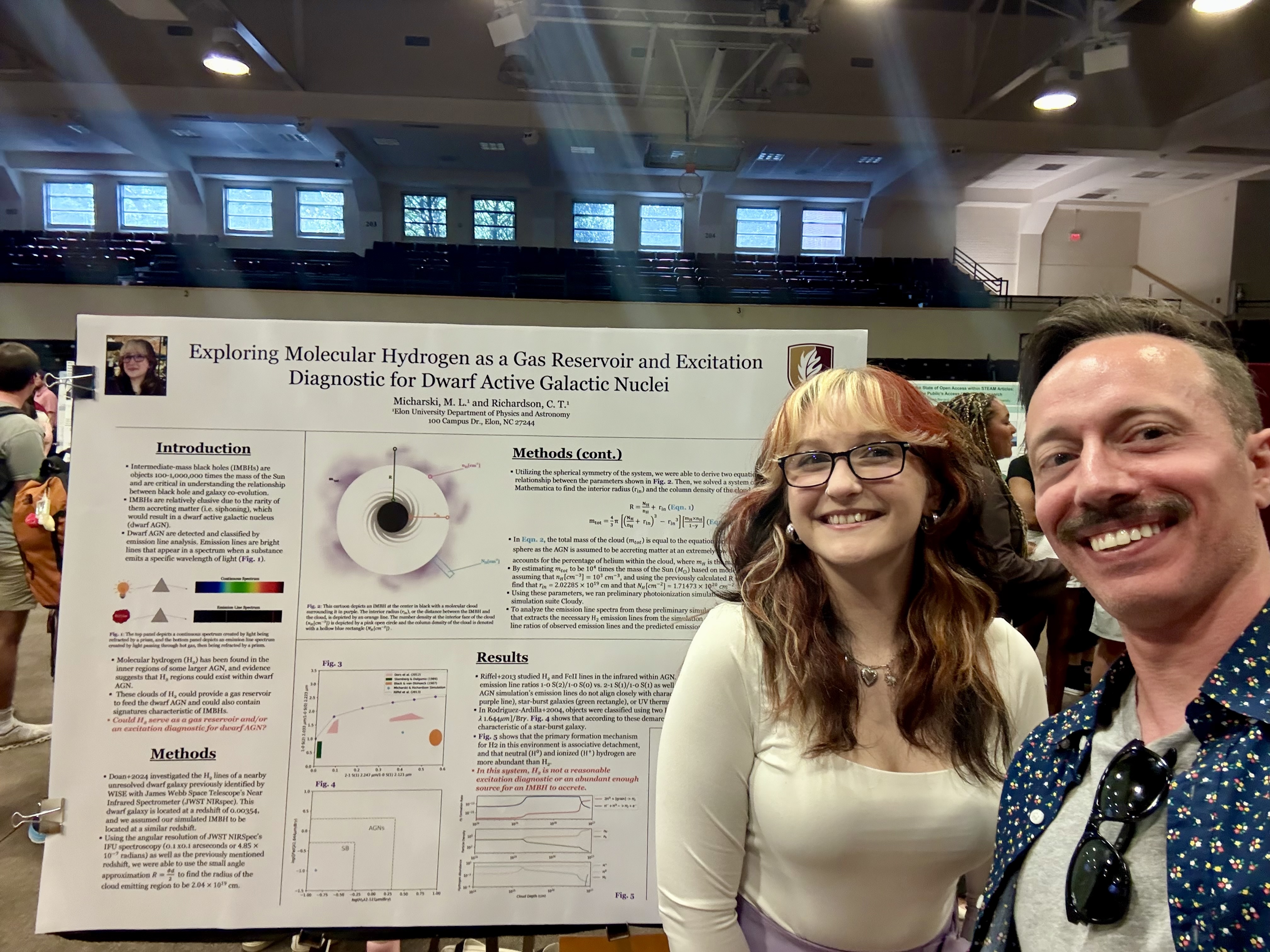 Our research group meets on a bi-weekly basis to discuss the progress on our individual projects, receive feedback from others, and outline the next steps that need to be taken. We often welcome visiting researchers to present their latest work and give guidance on professional development in the field. Everyone in our group work on distinct projects related to galaxies and/or accreting black holes. This allows each member of our group to have a unique project of their own, while still receiving constructive comments from others that are familiar with the topic. Elon students can start working on a project as early as their first year of classes. Mentor-menteee meetings (M3) pair up more advanced students with those early stages of reserach to discuss anything over coffee or lunch. Sudents in our group are involved in the entire scientific process, which involves project development, data collection, data analysis, presenting results, and publishing in top-tier, peer reviewed journals.